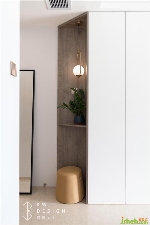 抬头望一望墙柜的一端,早已改换成了端景柜:中灰色隔断板层,内置小小一盆绿植,金属时尚挂灯静静洒下光芒。这是来自墙柜的温柔。收纳满分的它也并不总是沉闷而无趣的。