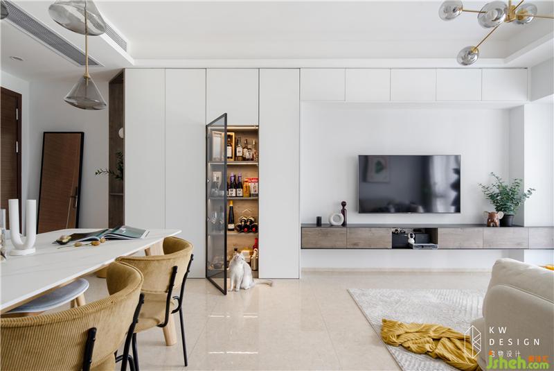 客厅的正面时尚感扑面而来:室内设计师设计的内藏灯带的酒柜,暖光搭配原木,透过黑色边框玻璃柜门瞟一眼珍藏的美酒,是广告片里品质生活的场景。