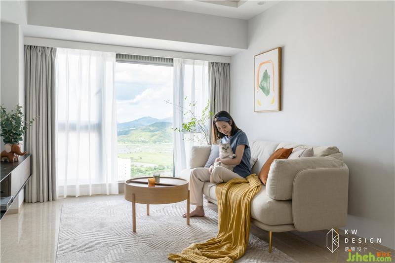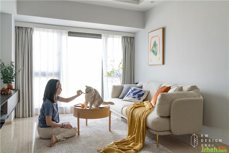 临近落地窗:客厅换了一副窗明几净,岁月静好的模样。品质感满分的米色布艺沙发搭配蜜糖色抱枕、浅黄色席子明快温暖。原木小圆桌精致轻巧,喵主子可以自由穿梭。