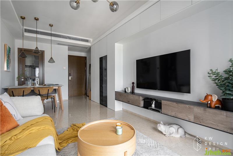墙柜一直延伸至电视背景墙,增添视觉延伸性,电视柜往里推进,离沙发越远,离视觉舒适越近。
