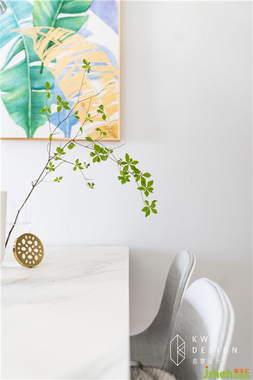 透过餐桌的绿植还可以窥探到另有一番风味的卧室。