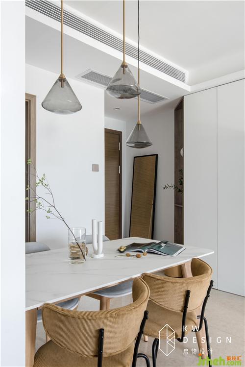 木色温润,爵士白清爽,灯芯绒沉静,黑色跳跃。餐厅的配色和材质选用绝了。室内设计师大面积原木色给予视觉的舒适。静与动、黑与白,方形和圆形的碰撞,是藏在舒适下的灵动。