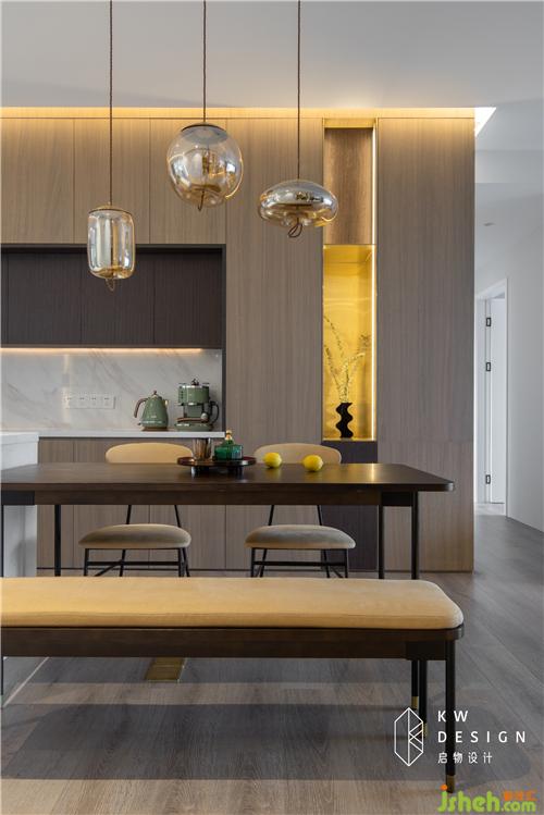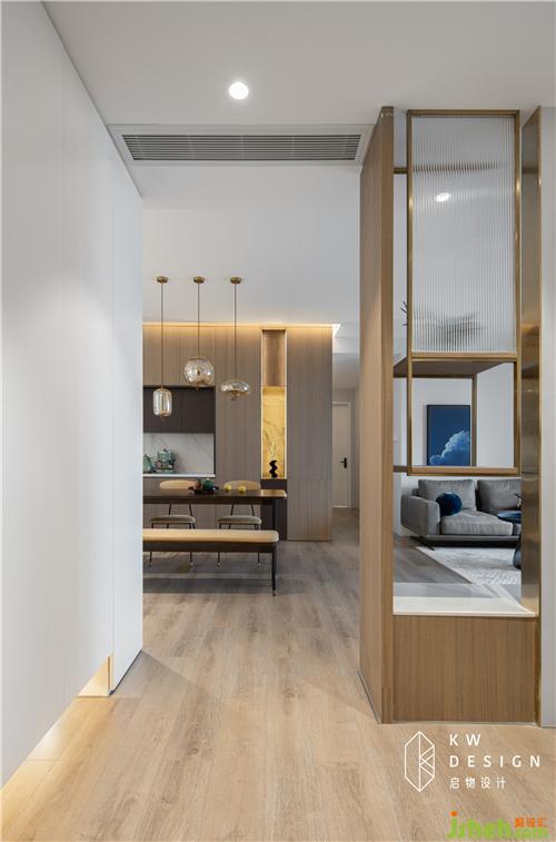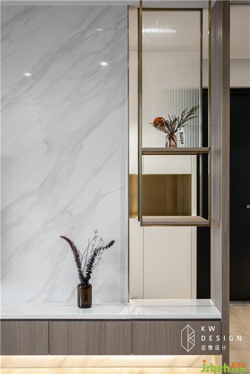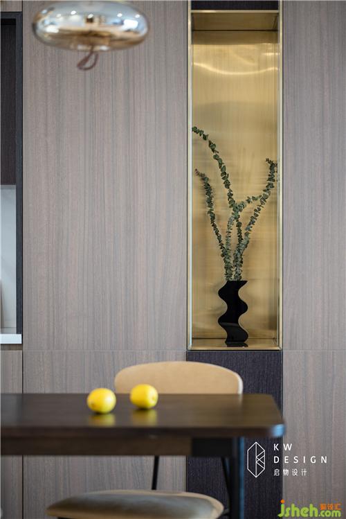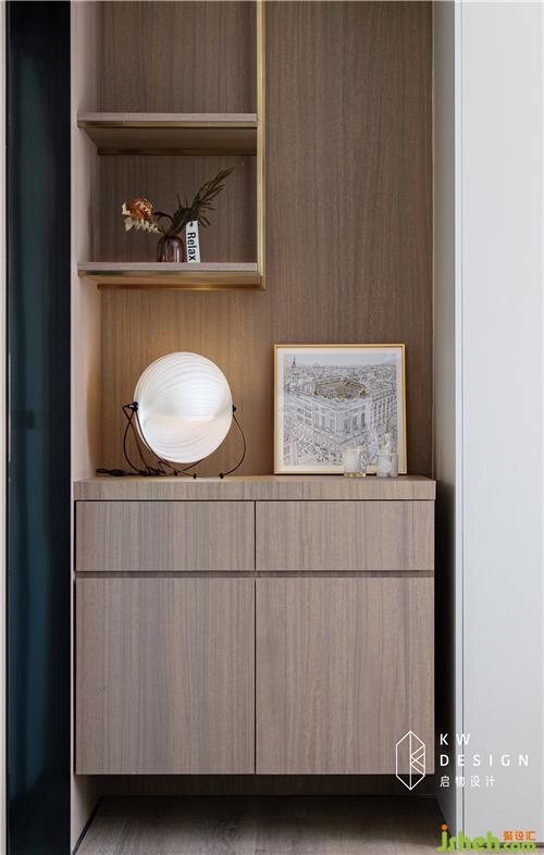 进门一眼可窥见的端景柜由启物木工现场制作,打破墙柜整体的沉闷感,使其收纳、美观两不误。内藏灯带,简单花瓶的摆放足以使人心旷神怡。