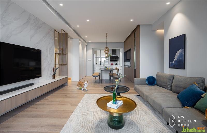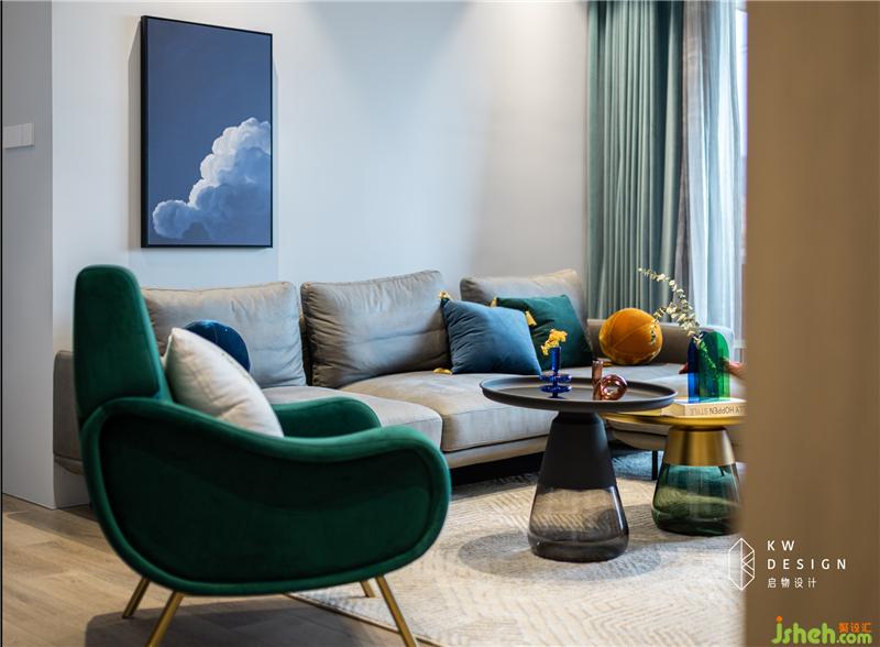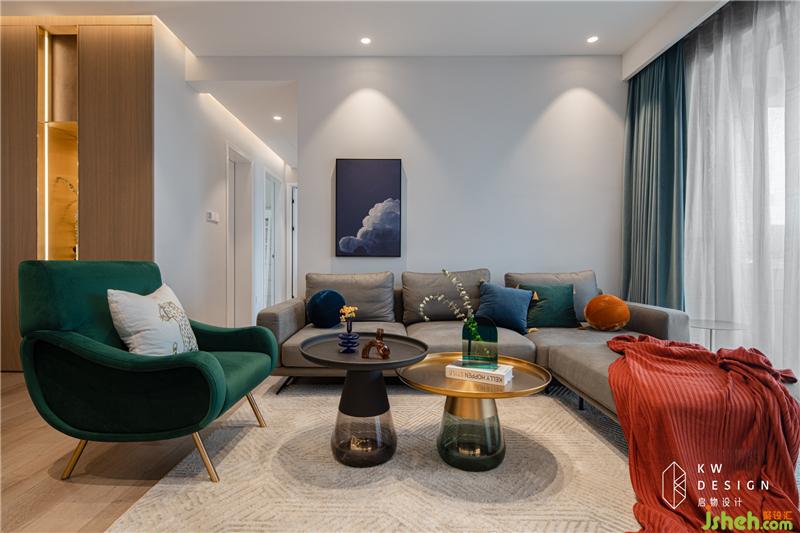 镂空柜架屏风的设置,视野开阔,更取客厅一角、简单摆设化为图景,整体通透明亮。