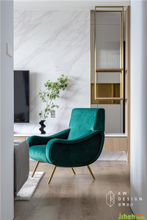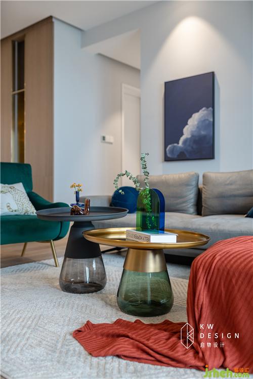 而蓝、绿、红抱枕饰品、米咖、金色玻璃拼接茶几、丹麦同色系异形花瓶等的采用既增添色彩活力,又让客厅具备满满设计感和新鲜度。