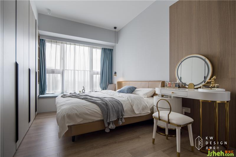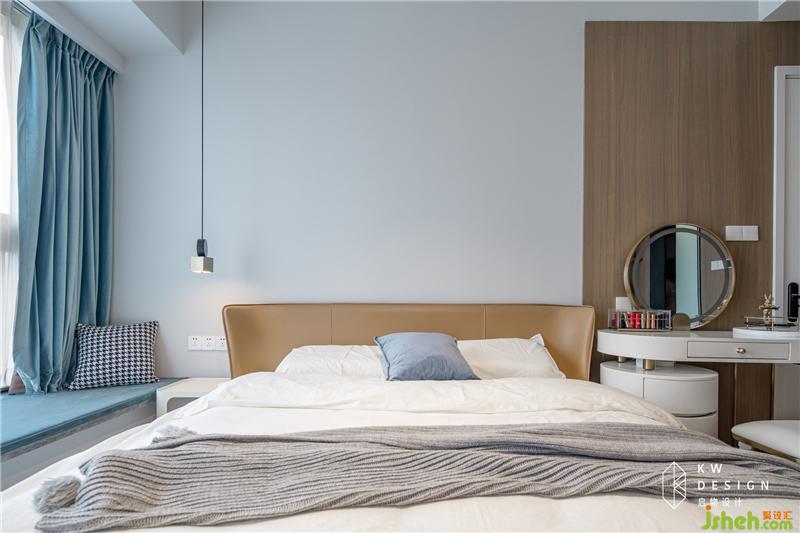 卧室整体偏简约温馨。皮质木色大床,搭配木质墙柜,木式墙面从梳妆台一直延伸至相邻墙面,打造视觉延伸感,打破白色墙体的单调沉闷。
