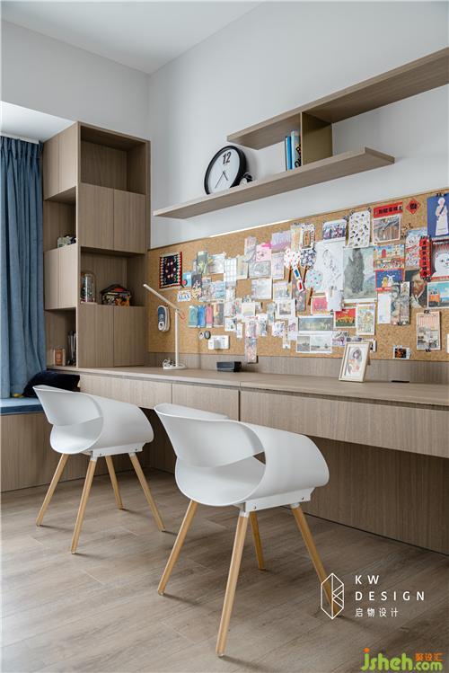 因为男女主喜欢旅游和摄影。设计师特地设置了一个软木板的墙面,可以用图钉将大大小小的照片定格在墙面展示。无限组合,循环使用。