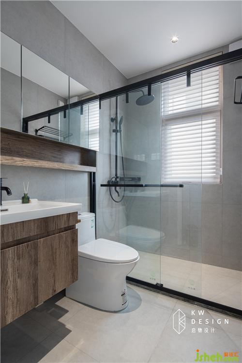 卫生间干湿分离,整体整洁利落。同时采用木质柜体,百叶窗,暖色照明灯等增添洗浴空间的温馨放松之感。