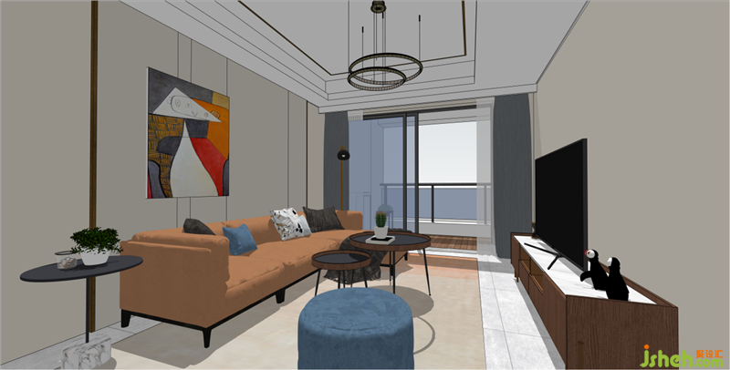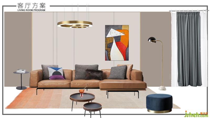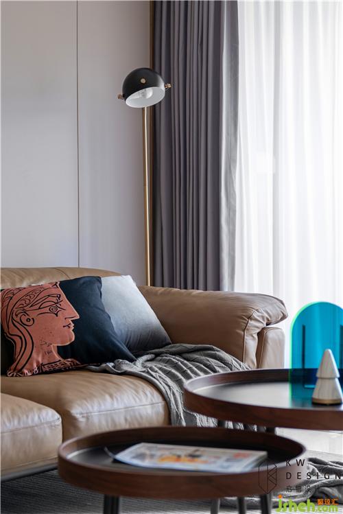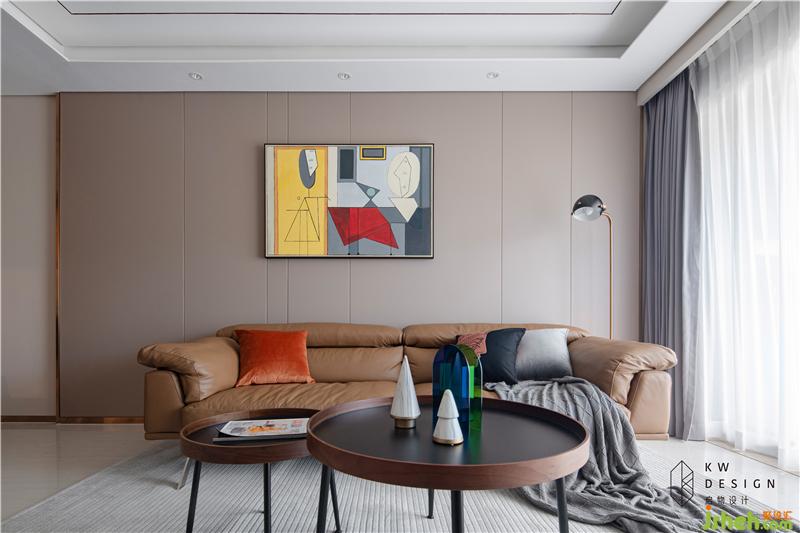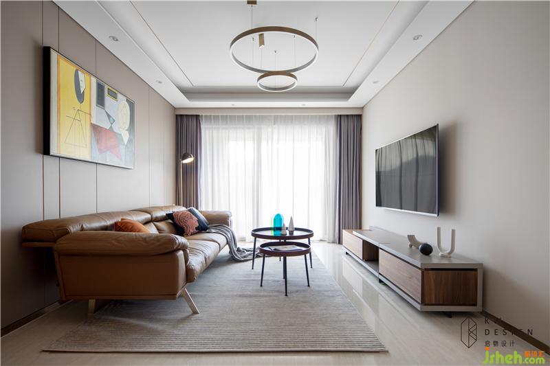 软装方案:室内设计师结合轻奢和简约风格元素,搭配简约轻巧型家具。棕橙色皮质沙发,上下呼应的大小圆形组合拼接的吊灯和茶几,极简线条金属落地灯,搭配素色窗帘和地毯,使整个空间灵动活泼。
