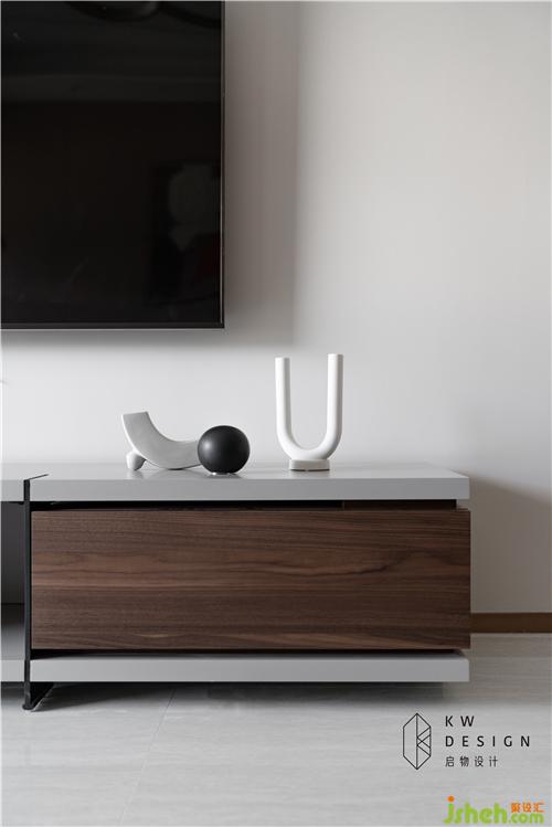 室内设计师取消电视背景的木饰面,刷上暖咖色乳胶漆,搭配简约胡桃木+烤漆灰电视柜。
