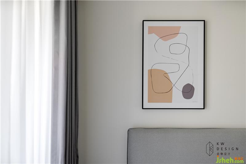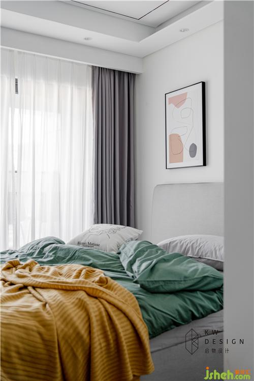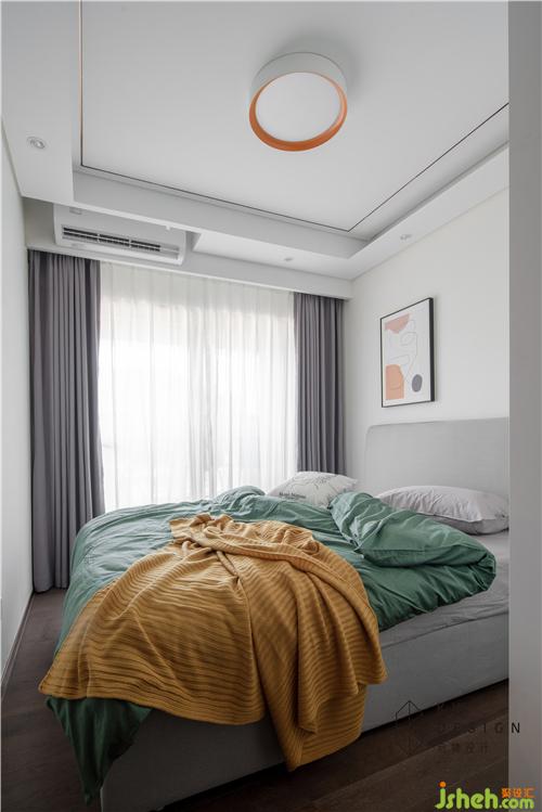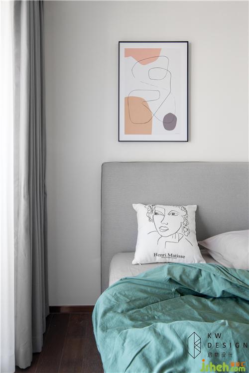 以灰色系打造素雅基调,利用床品增加色彩,营造简约清新的舒适空间。