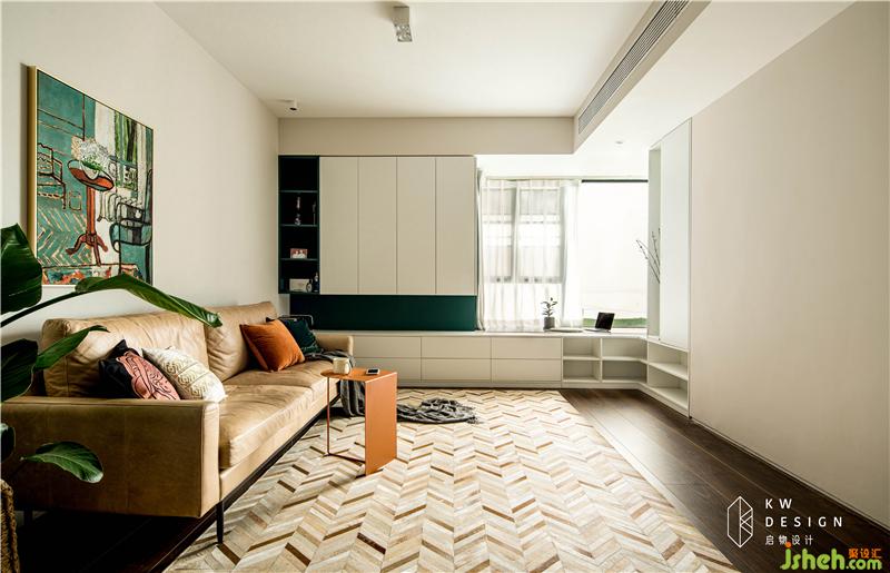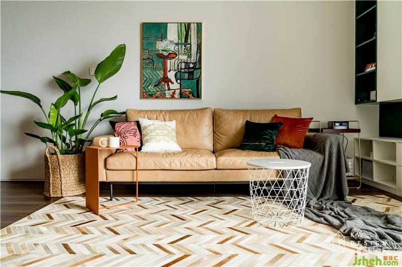 复古焦糖棕的双人沙发,爱马仕橙的简约边几,暖棕拼接式牛皮毯,景观效果极佳的鹤望兰,室内设计师和整个空间元素互相呼应协调统一的装饰挂画,每一处细节无不彰显屋主的生活态度和品质享受。