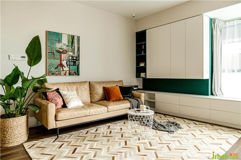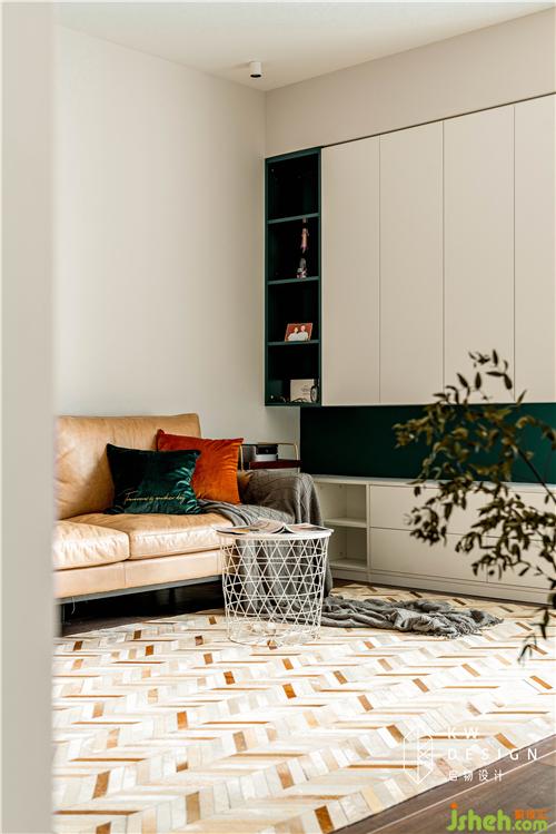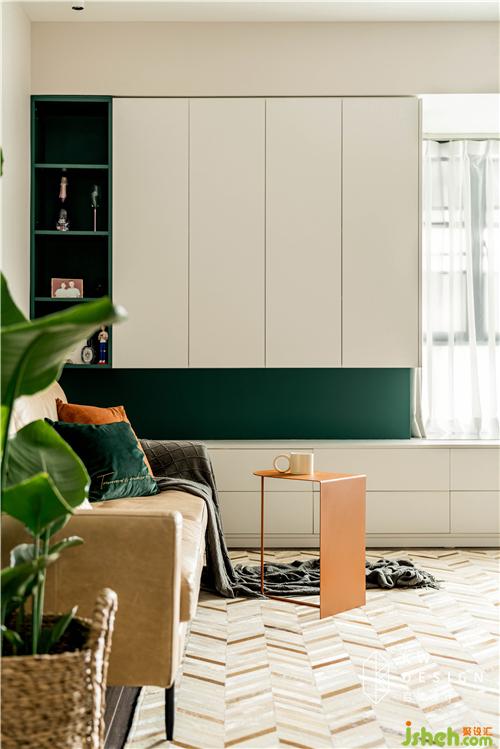 考虑进门玄关直通客厅并没有做隔断柜,直接就能看见阳台这面墙,半墙刷了高雅的墨绿色搭配白色储物柜和开放展示格做端景柜,室内设计师结合半边窗外的风景营造一幅动静合一的优美画面,给人入门眼前一亮的感觉。