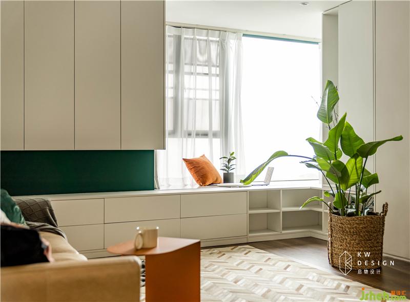飘窗位置加出30公分深储物柜,形成一个卧榻,考虑西晒问题平铺一块白色大理石面板,为屋主提供一处休闲观景的惬意角落。