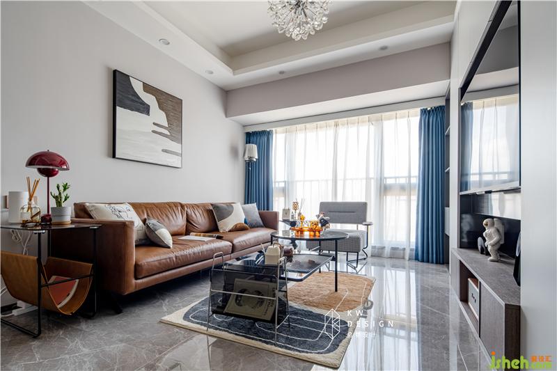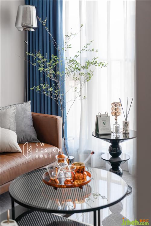 窗帘选择与棕色沙发撞色的宝蓝色,让空间更加艺术且个性。