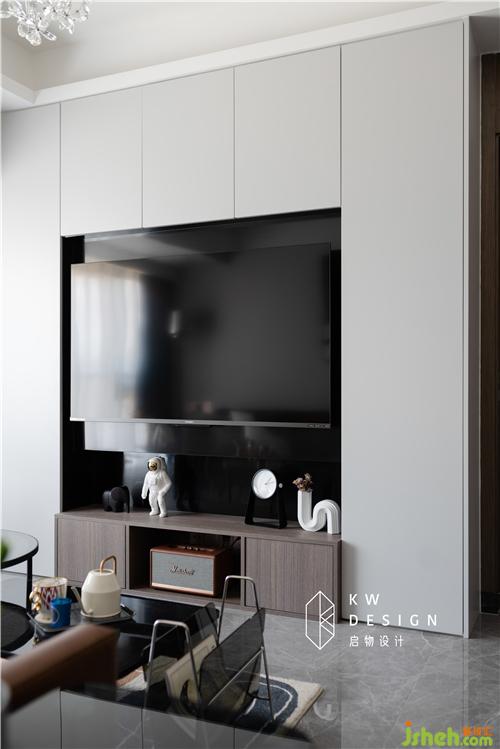 取消电视和沙发背景造型,改用简单大气的浅灰色墙漆打底,平柱到顶的电视柜,满足收纳的同时让空间更加规整。
