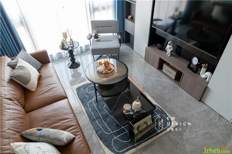 中间室内设计师采用黑色不锈钢做镂空处理,刚好放下60寸的电视,拉大开间视觉效果同时丰富背景墙造型感,搭配复古棕的马歇尔音响,实现客厅的视听功能。
