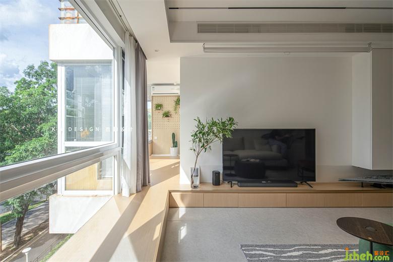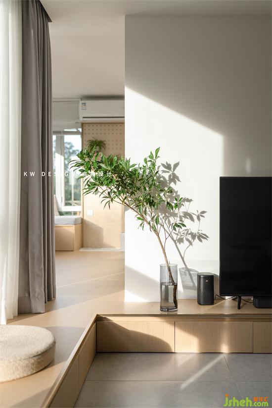 原木地台从电视墙延伸至窗台和阳光房,下方做抽屉满足日常物品和家中大量的书籍收纳,平台形成可卧可坐的惬意休闲区。有朋友小孩过来也可喜欢在这里玩耍了。