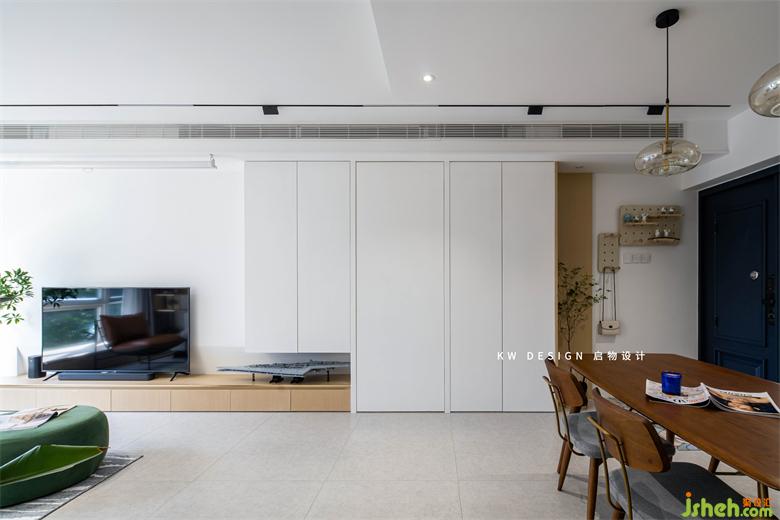 主卧设白色隐形门片,与玄关和客厅收纳融为一体,深圳家装设计过道吊顶增加黑色长条形轨道灯为白色立面增加层次感。
