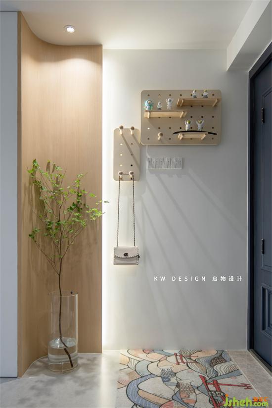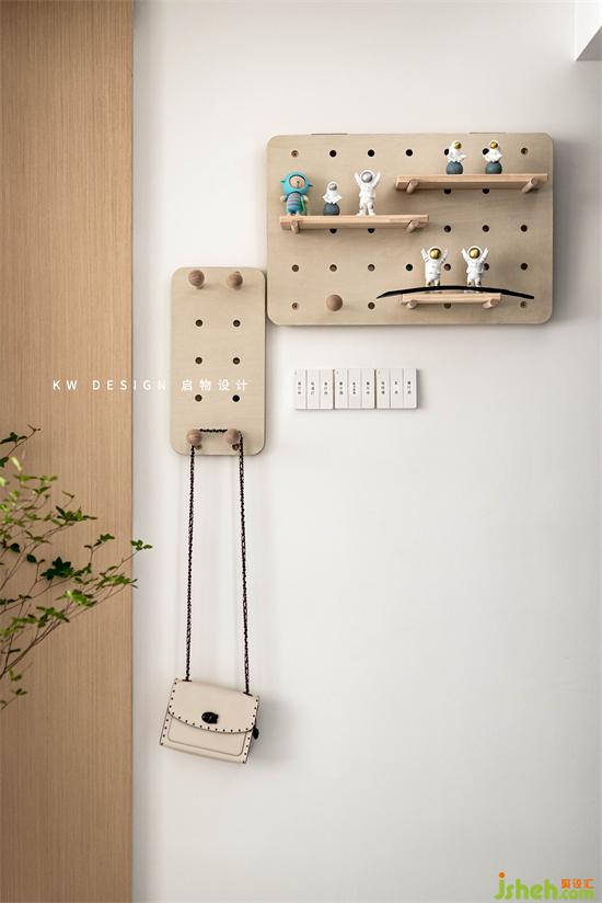 保证进门的简洁开阔感,墙面利用洞洞板做简单的收纳,深圳家装设计遮住电表箱,同时可随手搁置包包或外套。