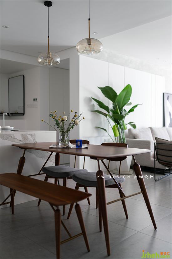 带有中古味道的的萝卜腿餐桌椅,是屋主在北欧表情里一眼相中的款,深圳家装设计选择1.6m的长度和条形椅凳搭配可以容纳更多用餐人数。吊灯的金属材质点缀上下呼应。