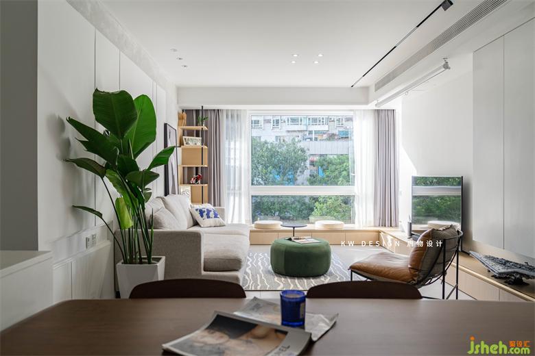 沙发背景以水泥灰与白色的简约块面组合而成,饰面板上做抽缝和回字形设计,深圳家装设计增加立面层次感。家装设计呼应墙面的几何造型,靠窗台位置做不规则展示架,可以放置N先生珍藏的各种手办或者S小姐旅途带回来的纪念品。
