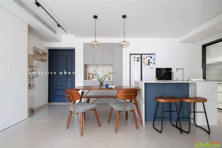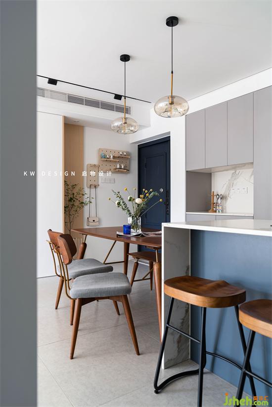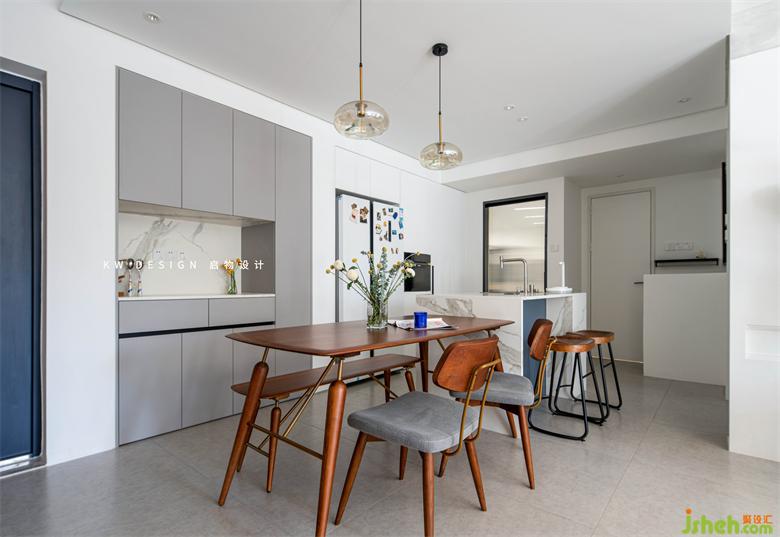 降低餐厨区吊顶做空间界定,大部分生活用品归置在立柜以及岛台下方的地柜,深圳家装设计轻食台与吧台的纯色块的点缀,搭配简单利落的家具线条结构,让3米长的一字型餐岛台,最大化保证屋主的功能需求同时呈现最舒适的空间尺度,生活气与艺术感和谐并存。
