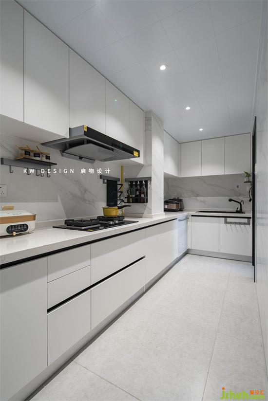考虑厨房狭长以及采光问题,深圳家装设计空间以放大视觉效果的白色为主,吊顶增设多点位灯源。
