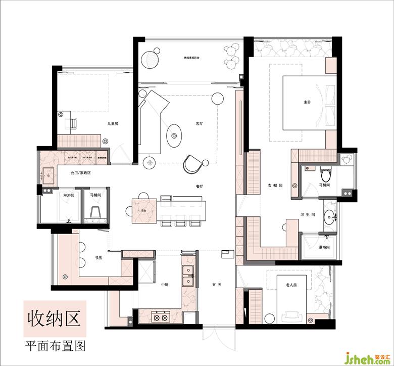 1:因为新家只是小两口住,把原本的小阳台纳入主卧,增加出三分离卫生间、衣帽间及梳妆台,同时保留客房的基本功能。