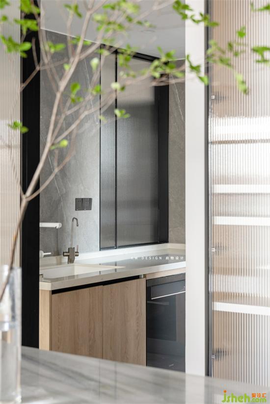 靠近厨房的墙面局部用长虹玻璃和柜体替代,丰富空间感,提高通透度。
