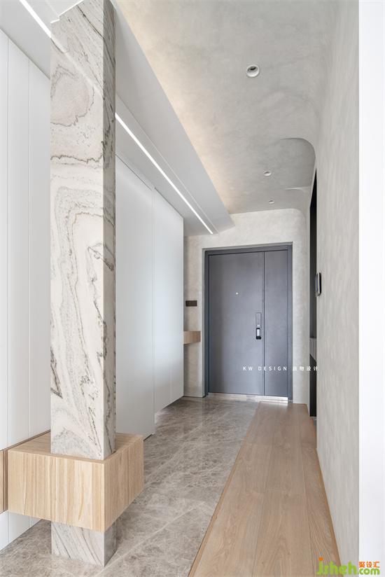 大理石长柱体类似雕塑感罗马柱在极简风中的简化。家装设计和原木块体的穿插设计丰富空间感也可以强化玄关感受。