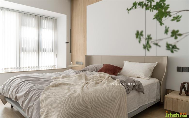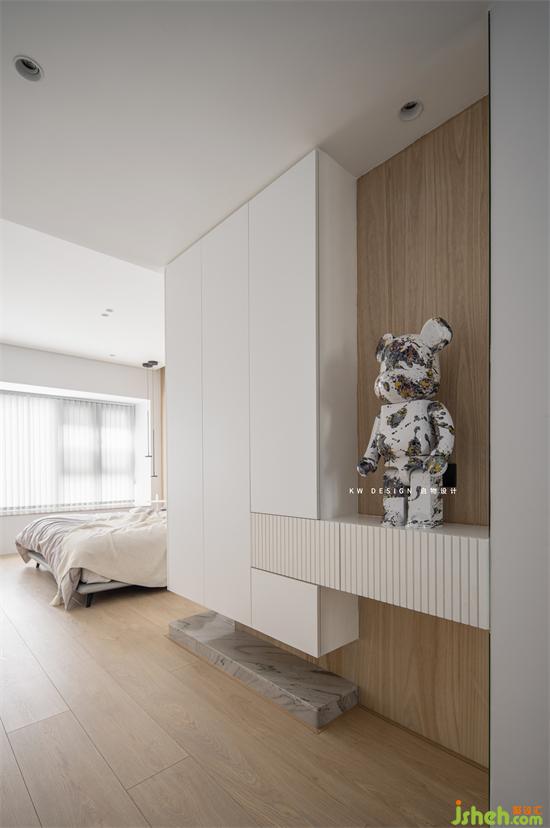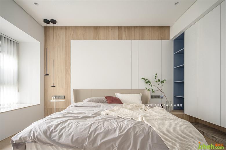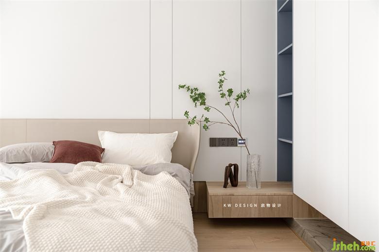 开放格和床边柜的连贯设计,使空间更极简和整体,视觉延续性更好。