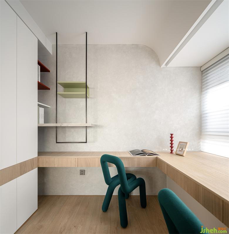 家装设计将靠近客餐厅公区的小次卧改造成美貌的书房,飘窗两人位书桌延展至书架,这样可以拓展书桌的使用区域,旁边可以放一些书籍。