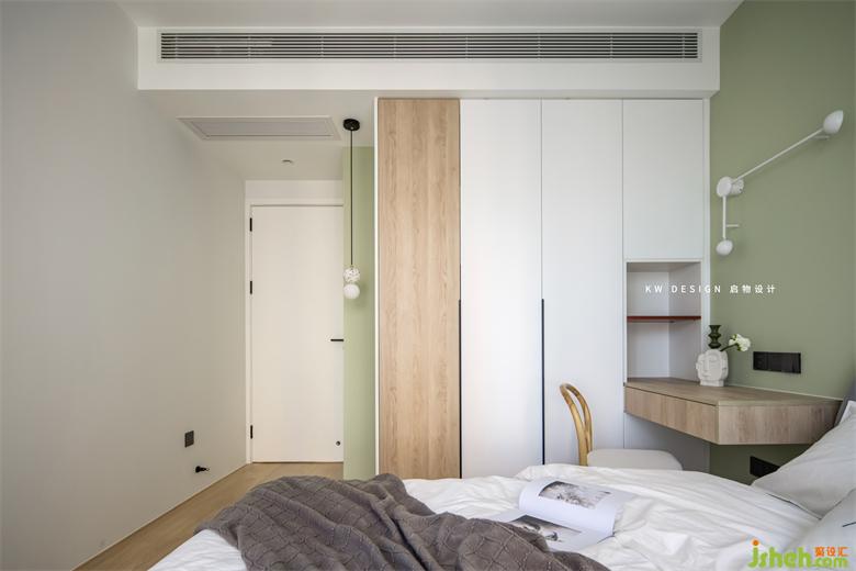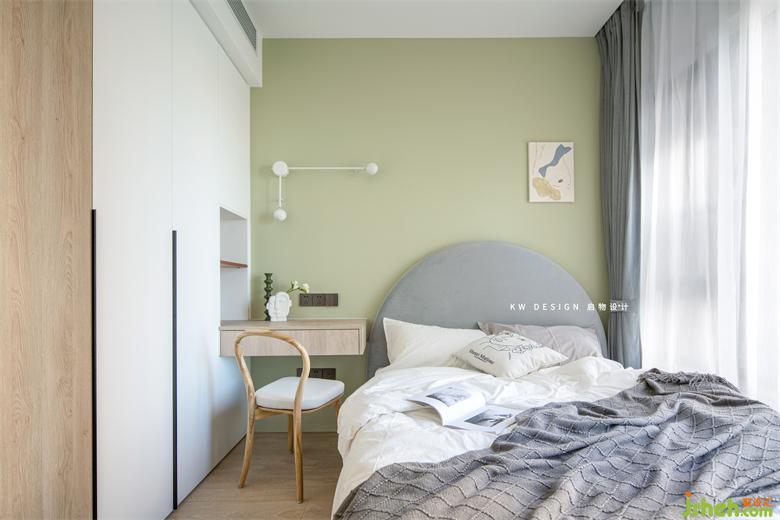 因为业主还没有小孩,所以这间房也会用作客卧,就不希望设计的太过童趣。在全屋的设计中,儿童房跳了一个灰绿色(实际)。整体也是比较时尚简约的设计。