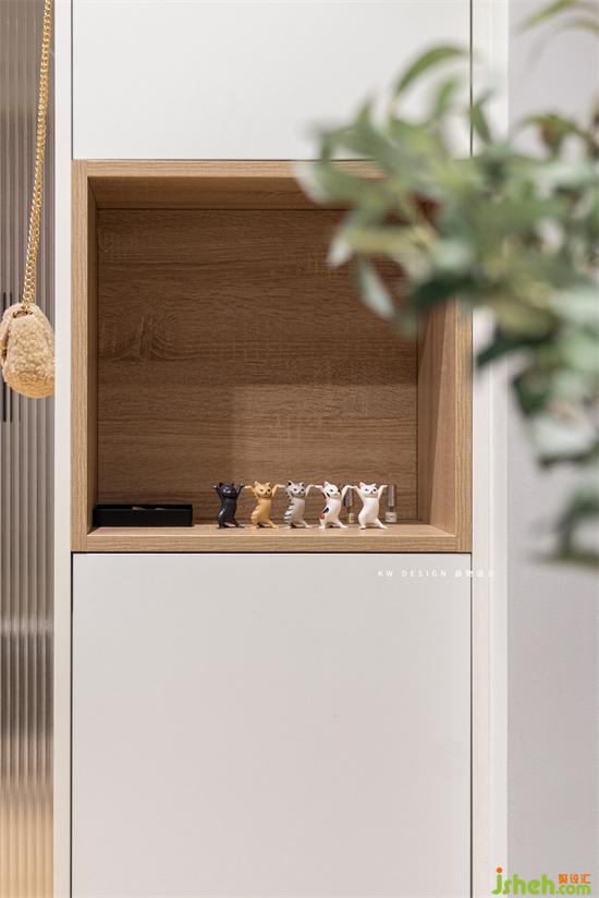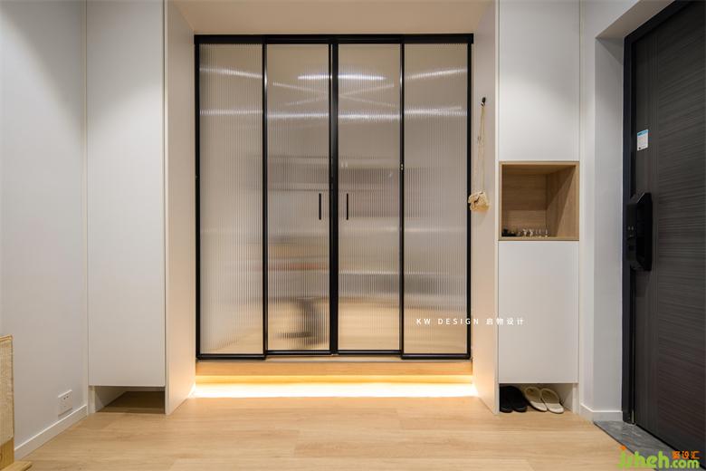 进门悬空的鞋柜,从下到上依次可安置:居家拖鞋、常穿的鞋子、回家随手放下的钥匙包包、不常穿的鞋子。