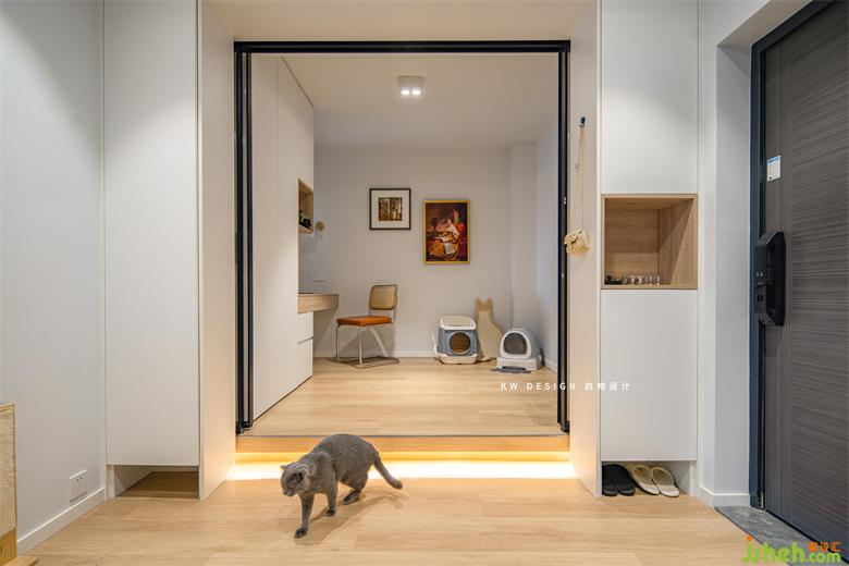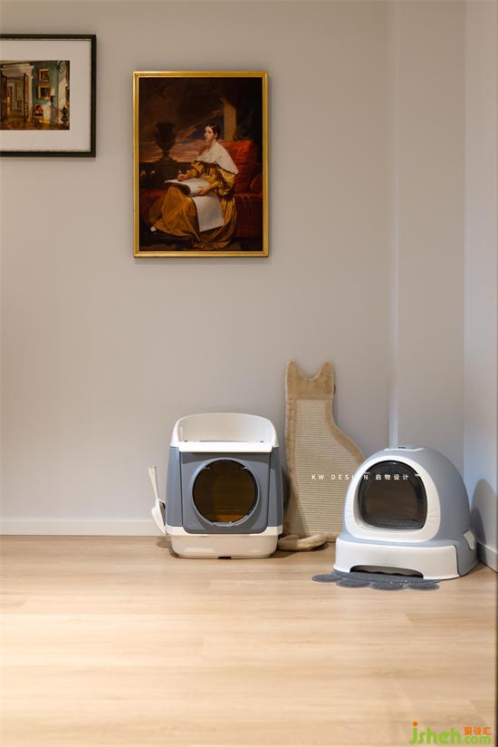 猫主子们的饭盆、猫砂盆安置在角落。抬头就是两幅提亮空间的艺术画。家装设计不知道日日穿梭其下,受艺术感染的猫咪会不会变的更聪明灵性呢?