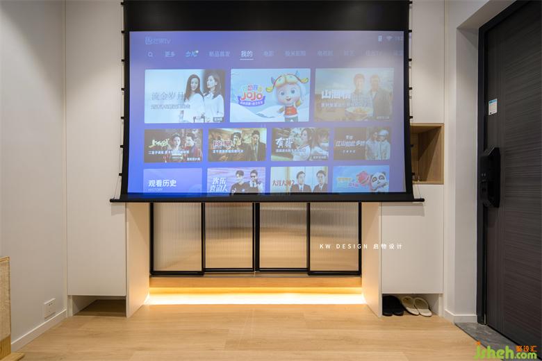 巧妙安置的投影仪,解决了电视墙的问题,超大屏幕,居家幸福值上升。合理距离维护双眼的健康。