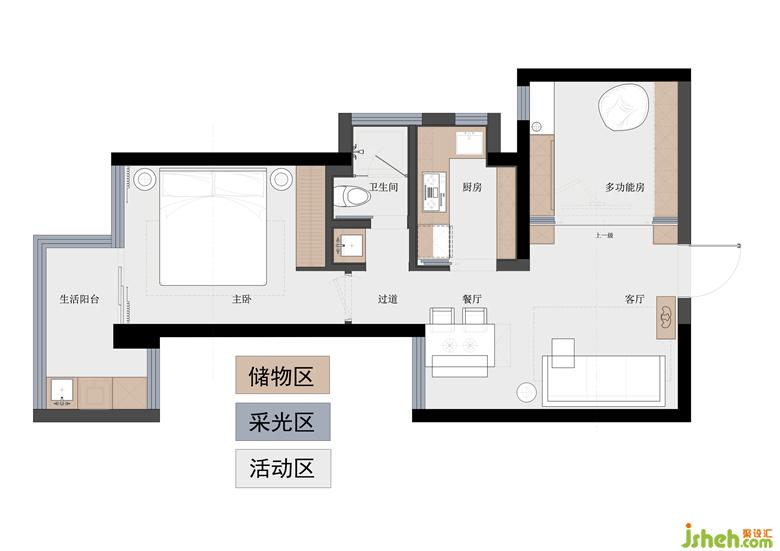 2:多功能室增设临时客房、书房、猫舍的功能。抬高地面做分区。加强客厅和多功能室的功能互动,以及人和猫咪的互动。