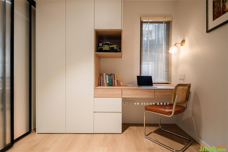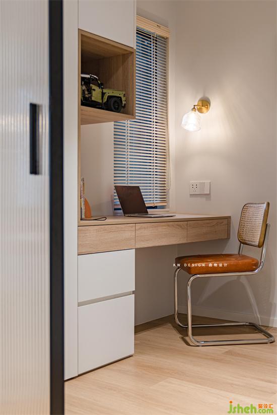 多功能房增设收纳柜,弥补收纳不足的缺陷,书籍、收藏品、日常用品均可安置在此处,靠窗一隅的书桌搭配皮椅、明亮壁灯。家装设计学习、工作氛围也是满分的。