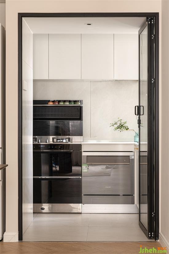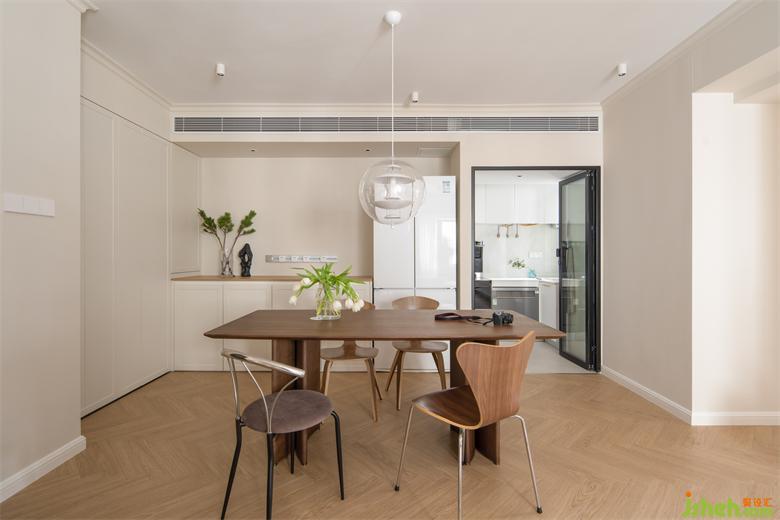 餐厅与厨房砌了一面薄墙使餐边柜和冰箱呈内嵌状态,景新花园家装设计削弱收纳的厚重体量,同时也拓展了厨房的径深腾挪出折叠推门的收纳位置,而不影响厨房的正常使用。
