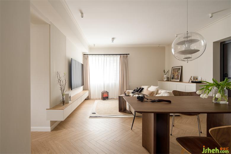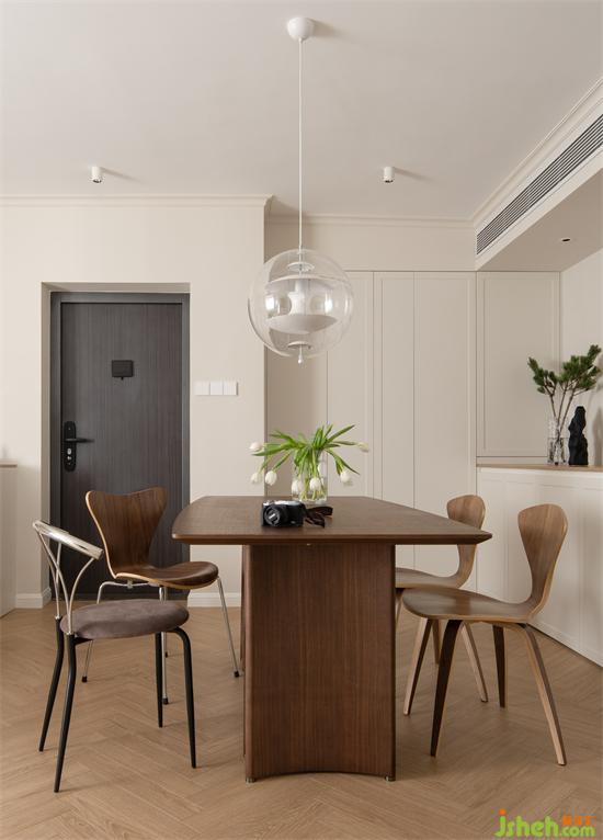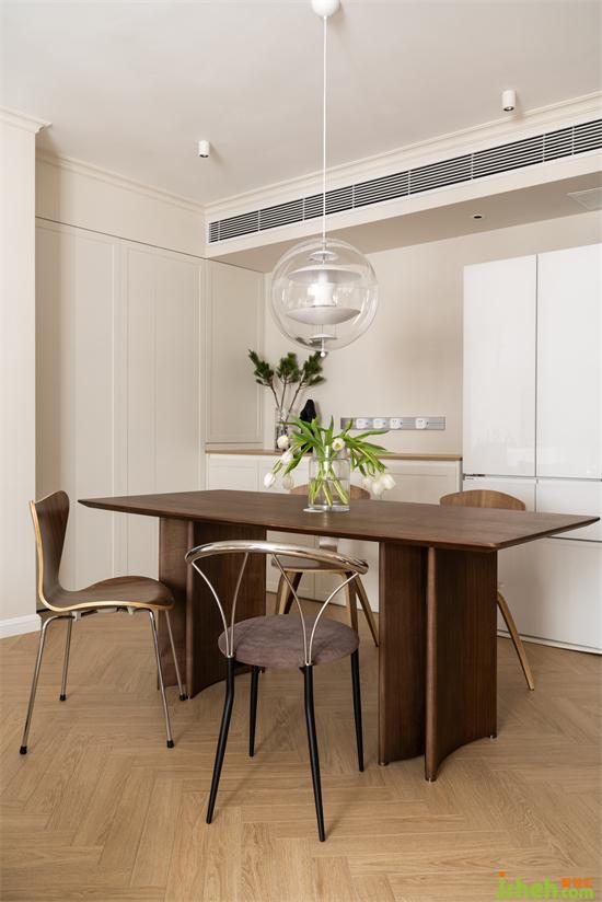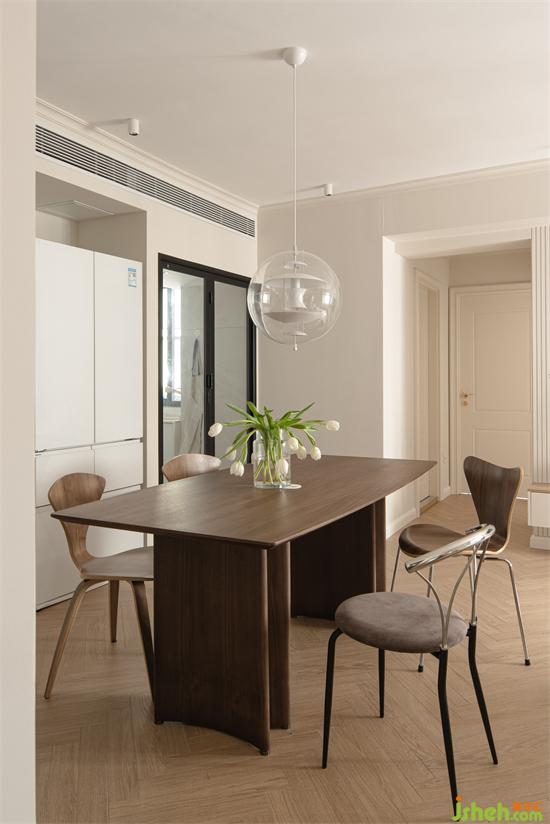 公领域唯一的主动是餐厅的星球吊灯,透明轻盈的球星框架搭配内部金属片,宛如无重力的空间漂浮,景新花园家装设计搭配中古餐桌和不同形态的餐椅,一深一浅,一实一虚,一方一圆,简单也丰富,多样也统一。