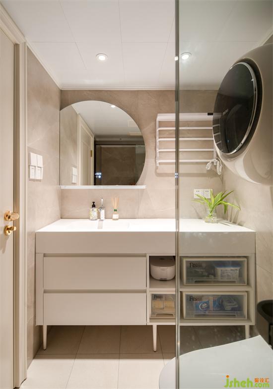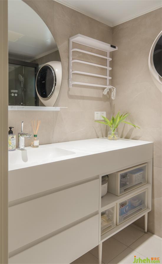 向次卧拓展了90公分开间刚好做淋浴区。浴室柜也得以延长至1.4m多,景新花园家装设计大台面和下方的强收纳装点女孩子的精致洗护日常。