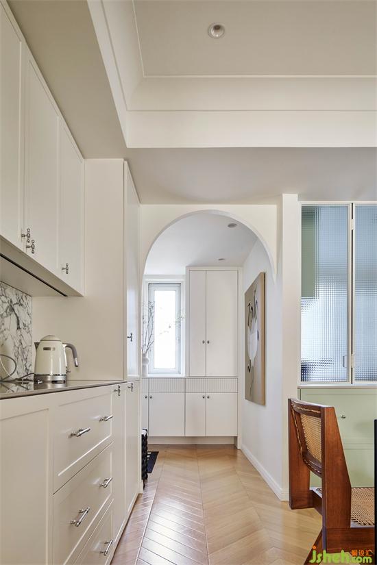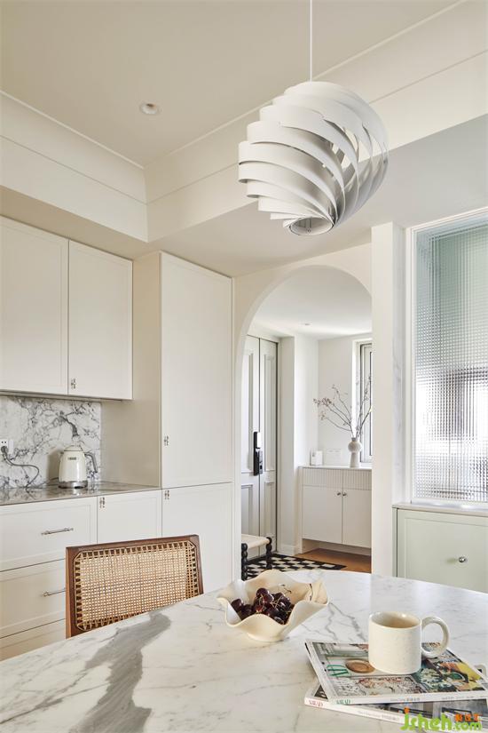 玄关与餐厅的过渡区域是唯一一处拱形垭口装饰,在进门处兼具审美功能同时弱化空间生硬转角。