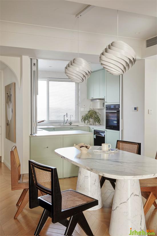 由圆润大气的大理石餐桌搭配精致中古餐椅围合空间枢纽,无扶手餐椅可以灵活收在餐桌底下,不占据活动空间尺度。