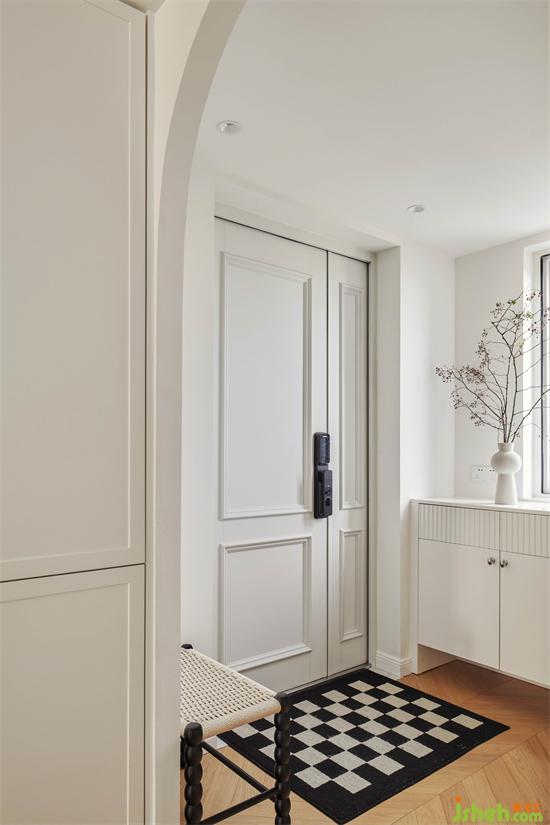 呼应室内简约奶白的空间基底,佳兆业悦峰复式装修设计入户更换白子母门,沿窗定制组合鞋柜,矮柜下方悬空方便换鞋放鞋,上方平台可放置随手物品或装饰物。