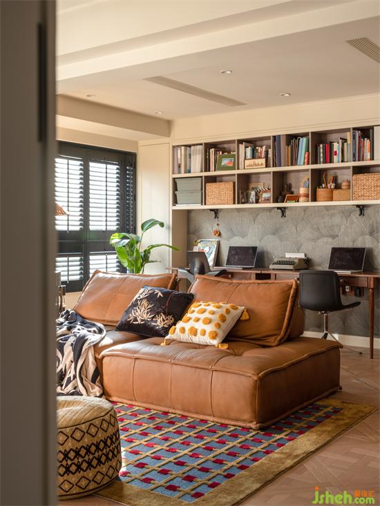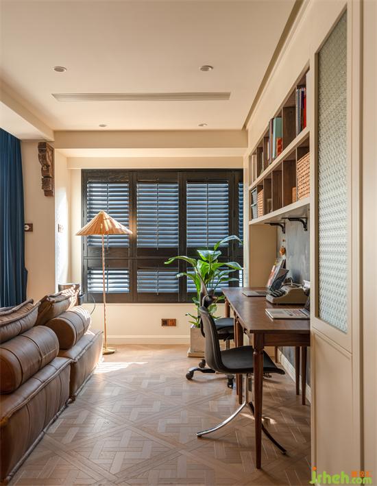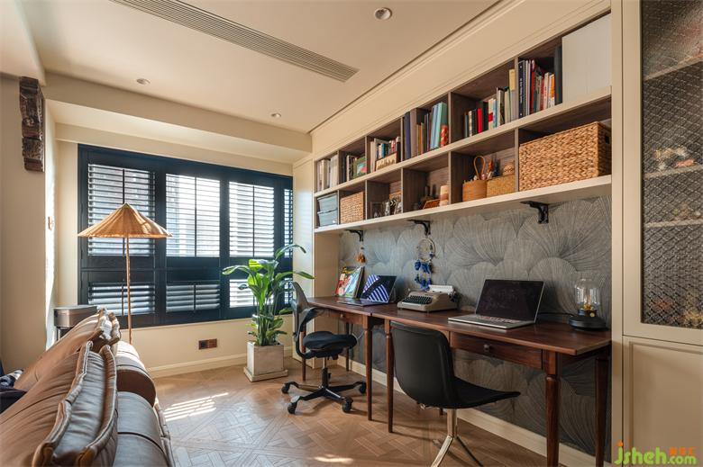 书房兼做多功能休闲区,窗边可以放一个懒人沙发作阅读角,海纳公馆家装设计释放的过道也可作为健身运动的空间。