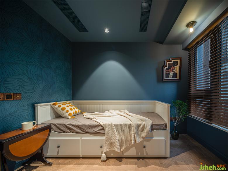 次卧延续东南亚风的壁纸装饰,通刷沉稳湛蓝色墙漆,床头床尾分别预留边几和书桌空间,短期做临时客房,未来根据需要再置换双人床或上下床。
