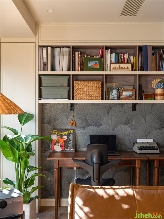 由收纳功能半围合而成的办公区兼具实用和展示,海纳公馆家装设计墙面粘贴贝壳纹样壁纸,深色系的放射状图案为复古空间带来清凉与热烈。