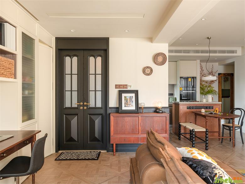 流畅的弧形拱门搭配压纹玻璃装饰私密空间,充满质感的黄铜拉手点缀黑色立面,构建出怀旧浪漫韵味。