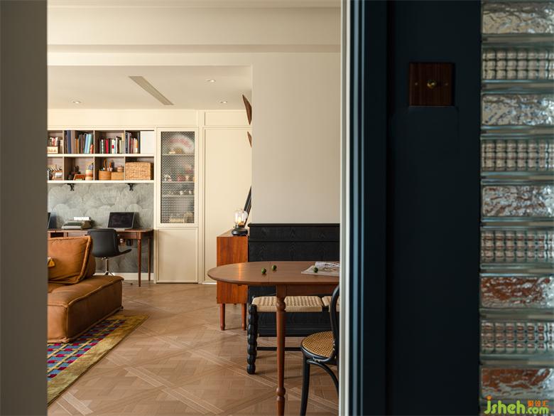 次卧与餐厅的墙体嵌入一排玻璃砖,引入光源。其朦胧通透的立体造型于装饰功能上为过道留白空间增加丰富层次。